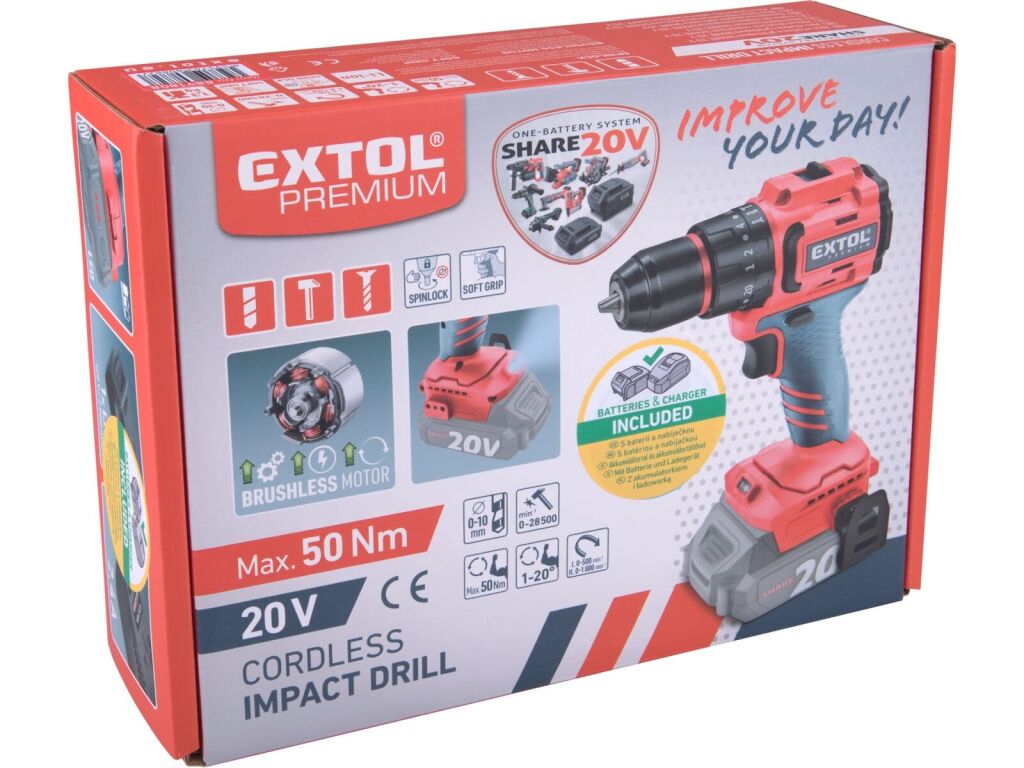EXTOL vrtací šroubovák aku s příklepem, BRUSHLESS, 20V Li-ion, 2000mAh (8791800)
