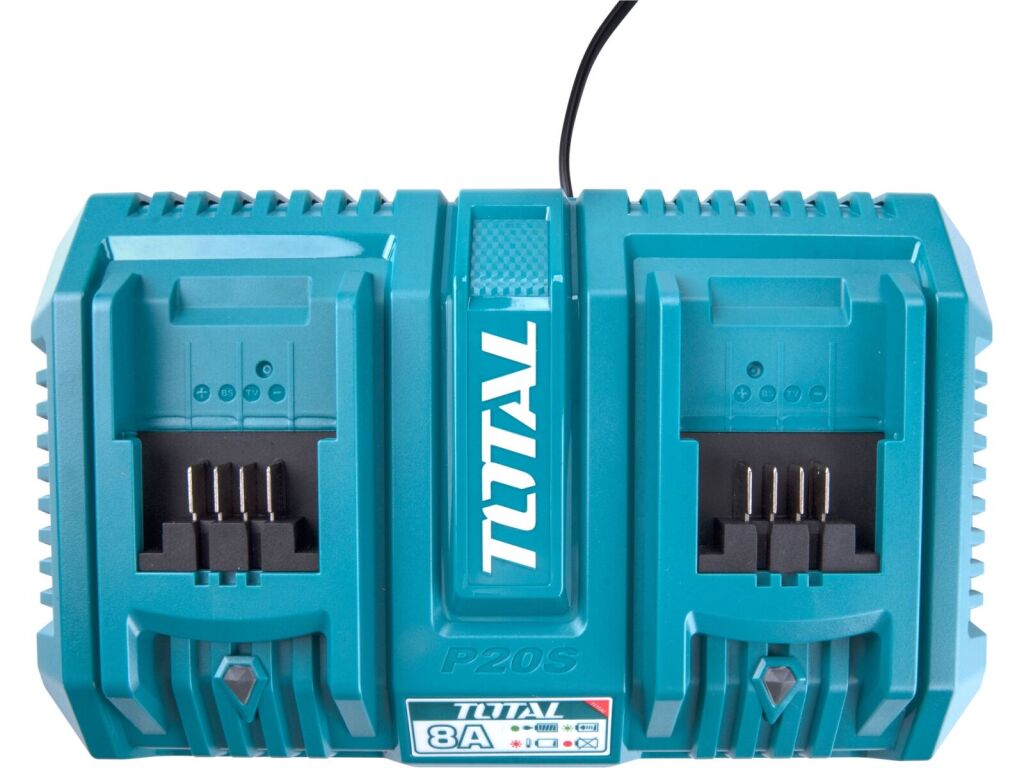 Duální nabíječky jsou určeny k nabíjení akumulátorů 20 V a umožňuje nabíjet dva akumulátory současně (nezávisle na sobě). • Nabíječka nabíjí, sleduje a vyhodnocuje nabíjení každého akumulátoru samostatně nezávisle na druhém akumulátoru. Nabíječkou lze současně nabíjet akumulátory s různými kapacitami. Akumulátor s nižší kapacitou bude nabitý dříve než akumulátor s vyšší kapacitou. • Nabíječky mají elektronickou ochranu proti nadproudu, proti přebití, proti přehřátí, signalizaci v případě poruchy a automaticky ukončí nabíjení, jakmile je akumulátor nabit. Nemůže tedy dojít k přebíjení akumulátoru, pokud je v nabíječce zasunut i po jeho plném nabití. Konektory nabíječky nejsou pod napětím, pokud v nabíječce není zasunut akumulátor. Hmotnost nabíječky je 1,205kg.